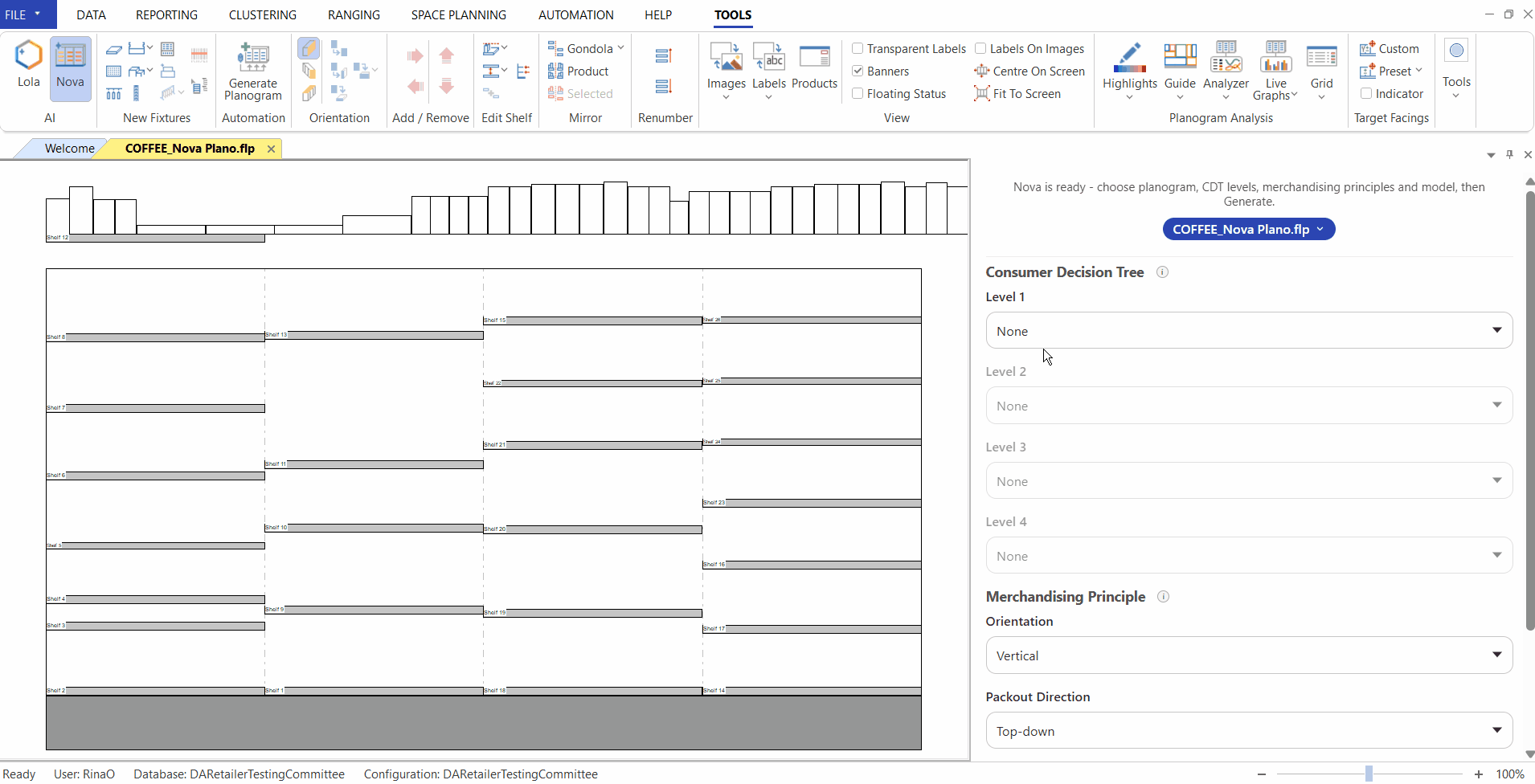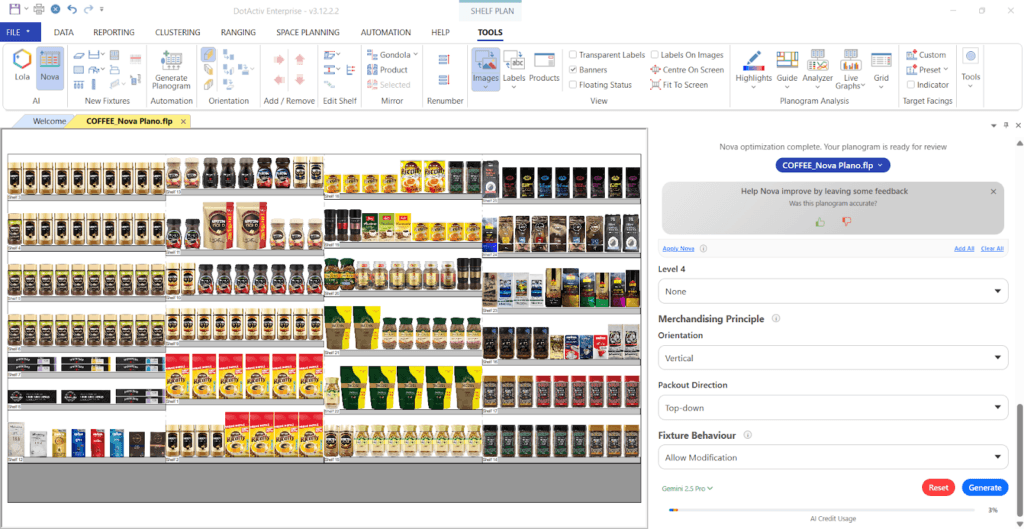 Once Nova has completed the run, the generated output will automatically appear on the DotActiv window. The user is able to apply manual changes to the planogram for additional refinements. The best way to approach manual changes is to reference the available DotActiv reports to understand the impact they have on the planograms (Live Graphs, Highlights, Planogram Analyzer etc).