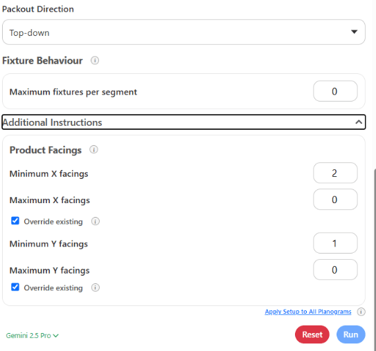 - Maximum fixtures per setting which should limit the number of fixtures Nova will place in each segment on the planogram.