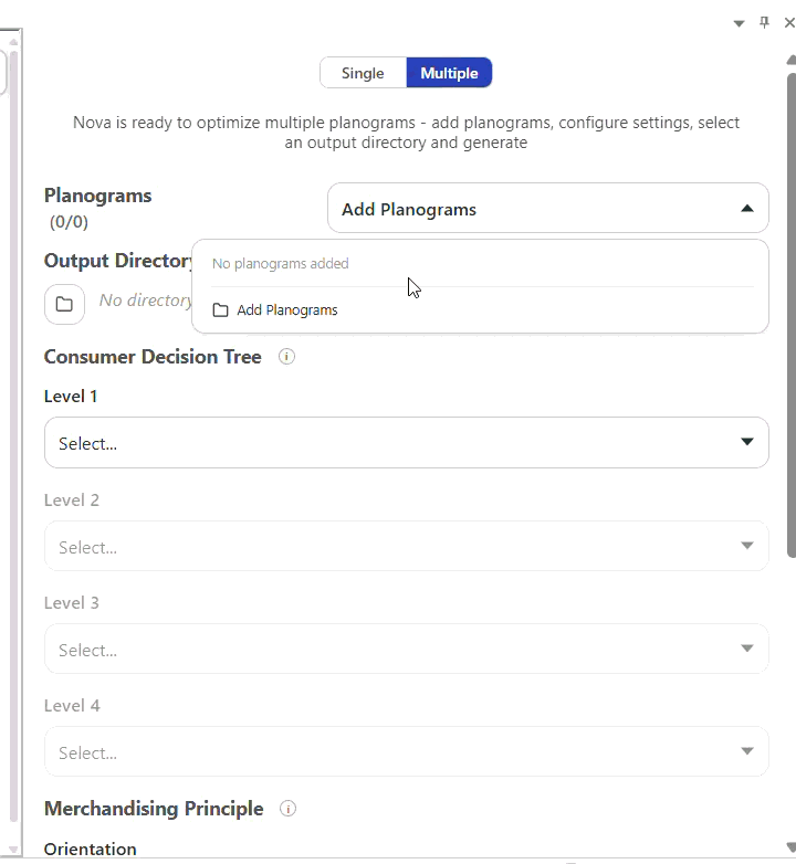 Step 2: Select whether you would like to run a single or multiple planograms but toggling between the “Single” or “Multiple” options.